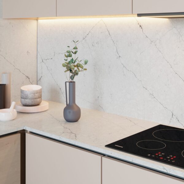 La sua superficie non porosa lo rende resistente alle macchie, preservando la brillantezza nel tempo. Inoltre, il quarzo è estremamente durevole, proteggendo da graffi, urti e calore, caratteristiche essenziali per un piano di lavoro funzionale e di lunga durata.